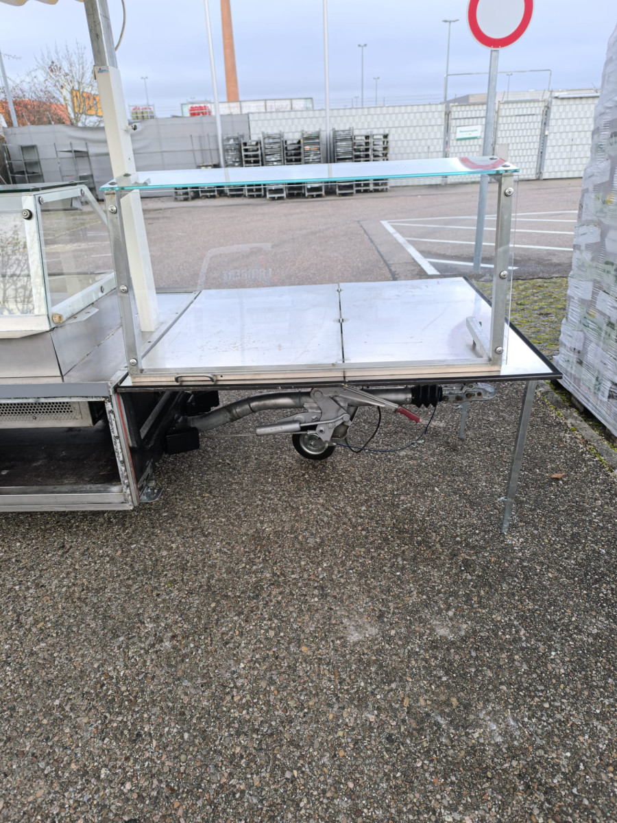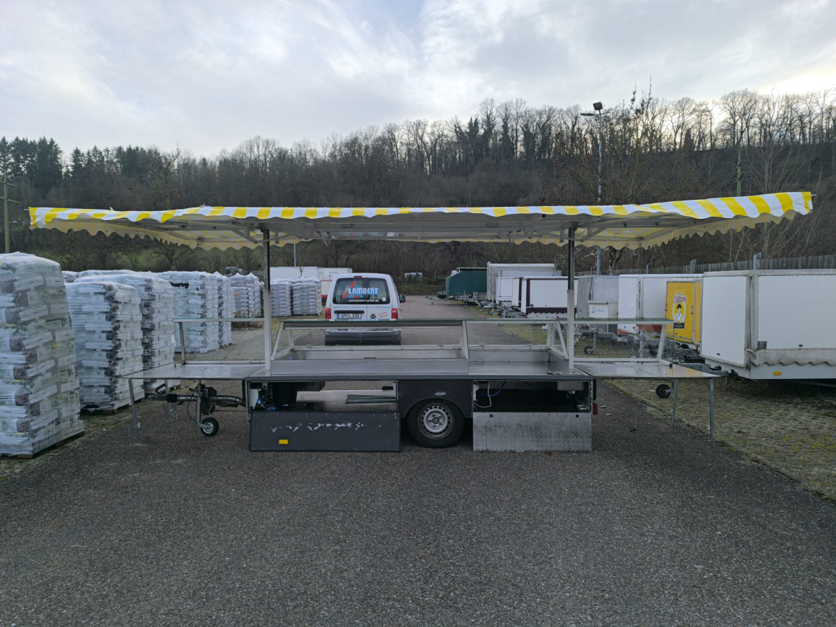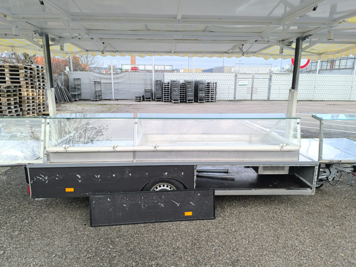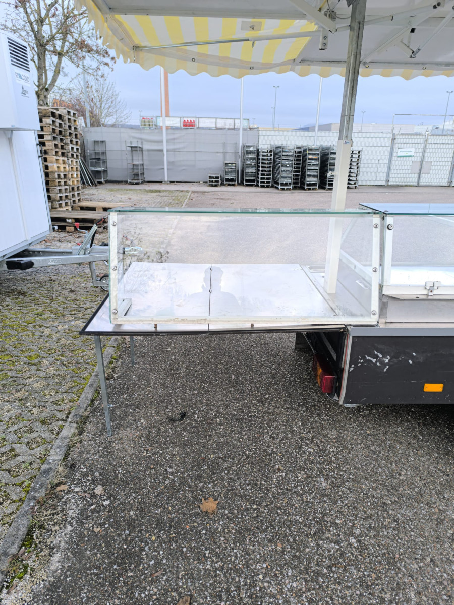 Ausstattung: Dachplane Gelb-weiss - TÜV wird Neu gemacht bei Abverkauf - Zulässiges Gesamtgewicht: 950kg - Strom und LED-Beleuchtung - Kühlwanne mit stiller Kontaktkühlung 1,92 x 0,80m + 1,0m Vitrine ohne Kühlung - Aufsatzvitrinen für die seitlichen Klapptische - Waschbecken auf der Theke