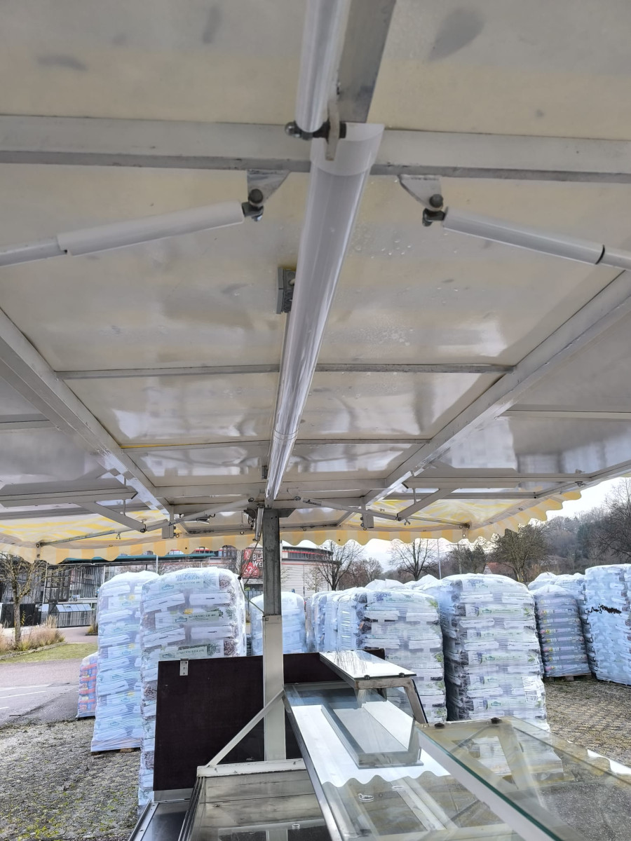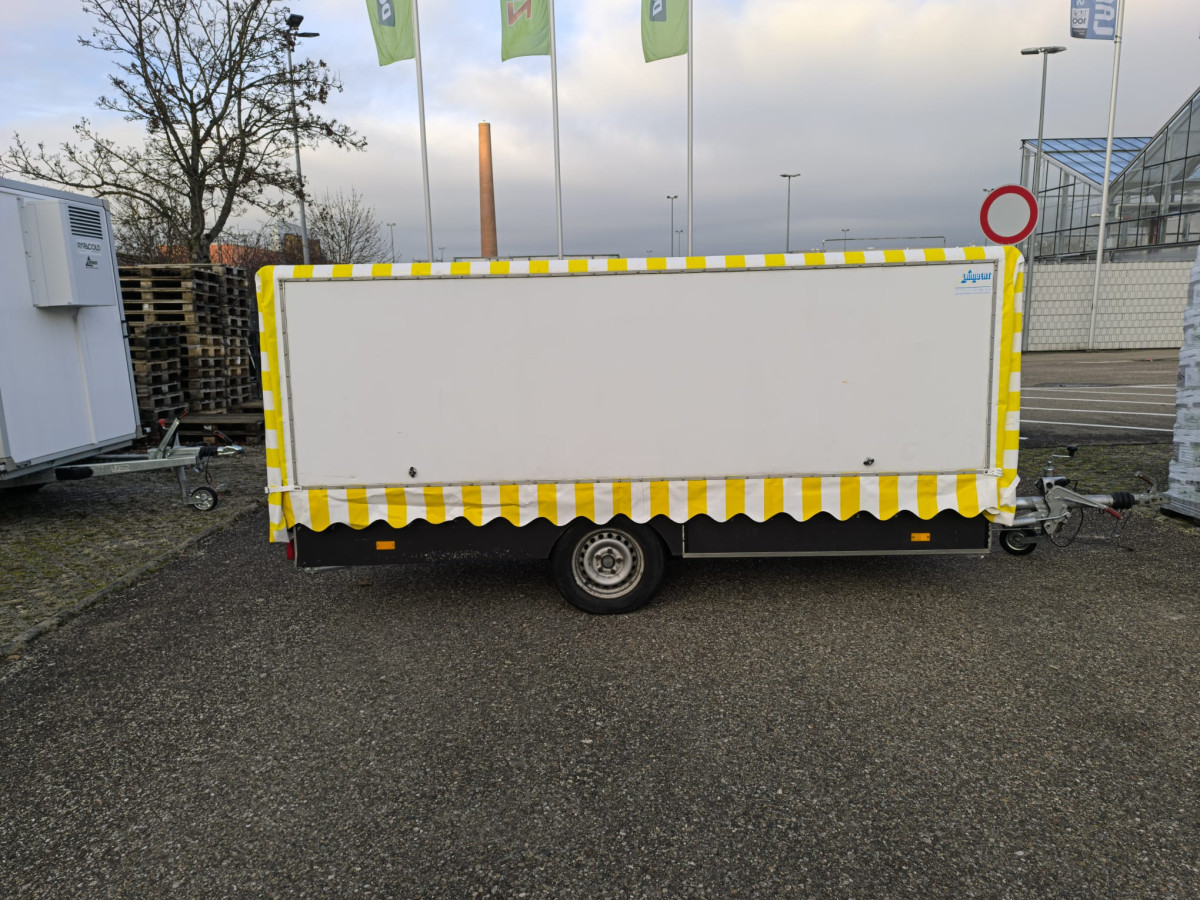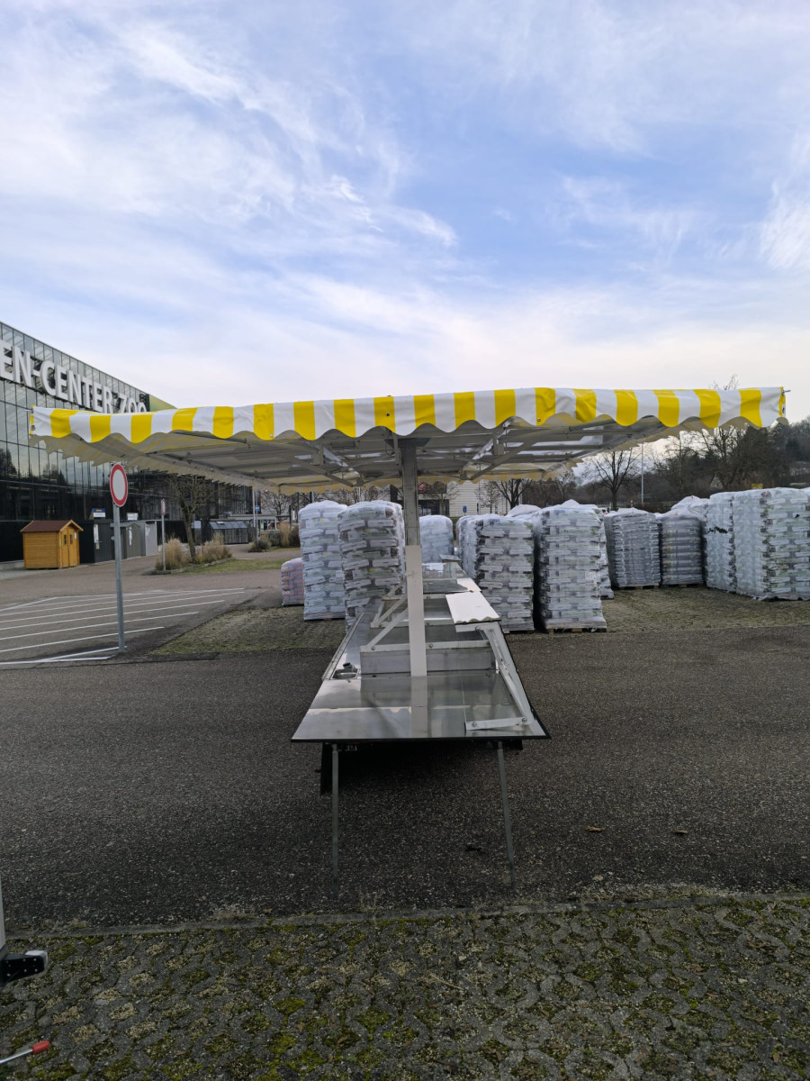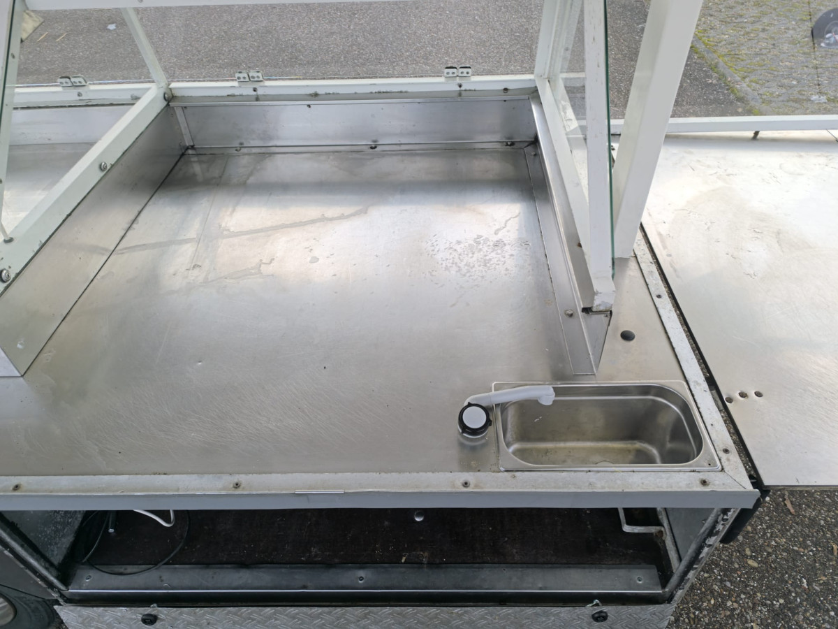 Ausstattung: Dachplane Gelb-weiss - TÜV wird Neu gemacht bei Abverkauf - Zulässiges Gesamtgewicht: 950kg - Strom und LED-Beleuchtung - Kühlwanne mit stiller Kontaktkühlung 1,92 x 0,80m + 1,0m Vitrine ohne Kühlung - Aufsatzvitrinen für die seitlichen Klapptische - Waschbecken auf der Theke